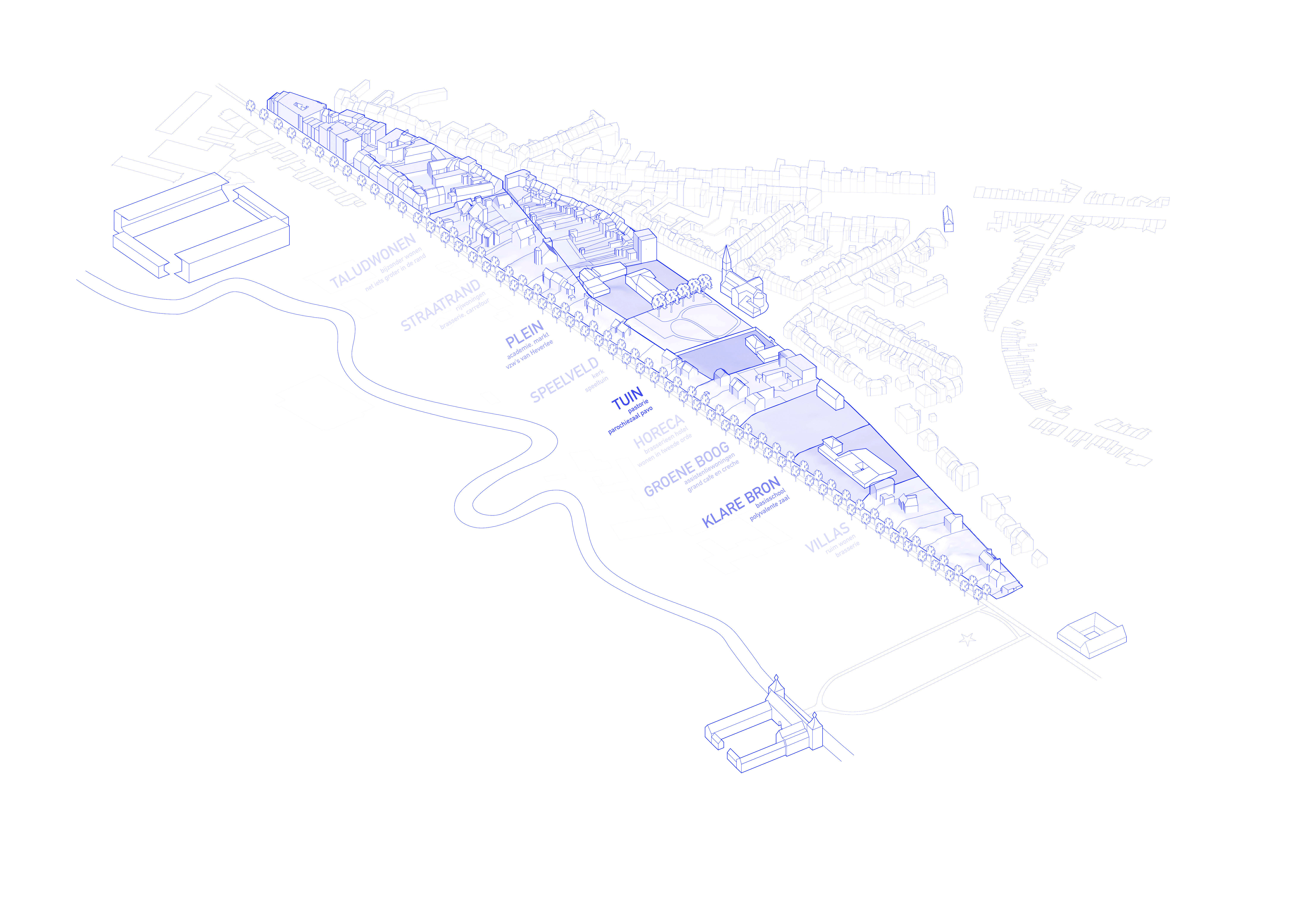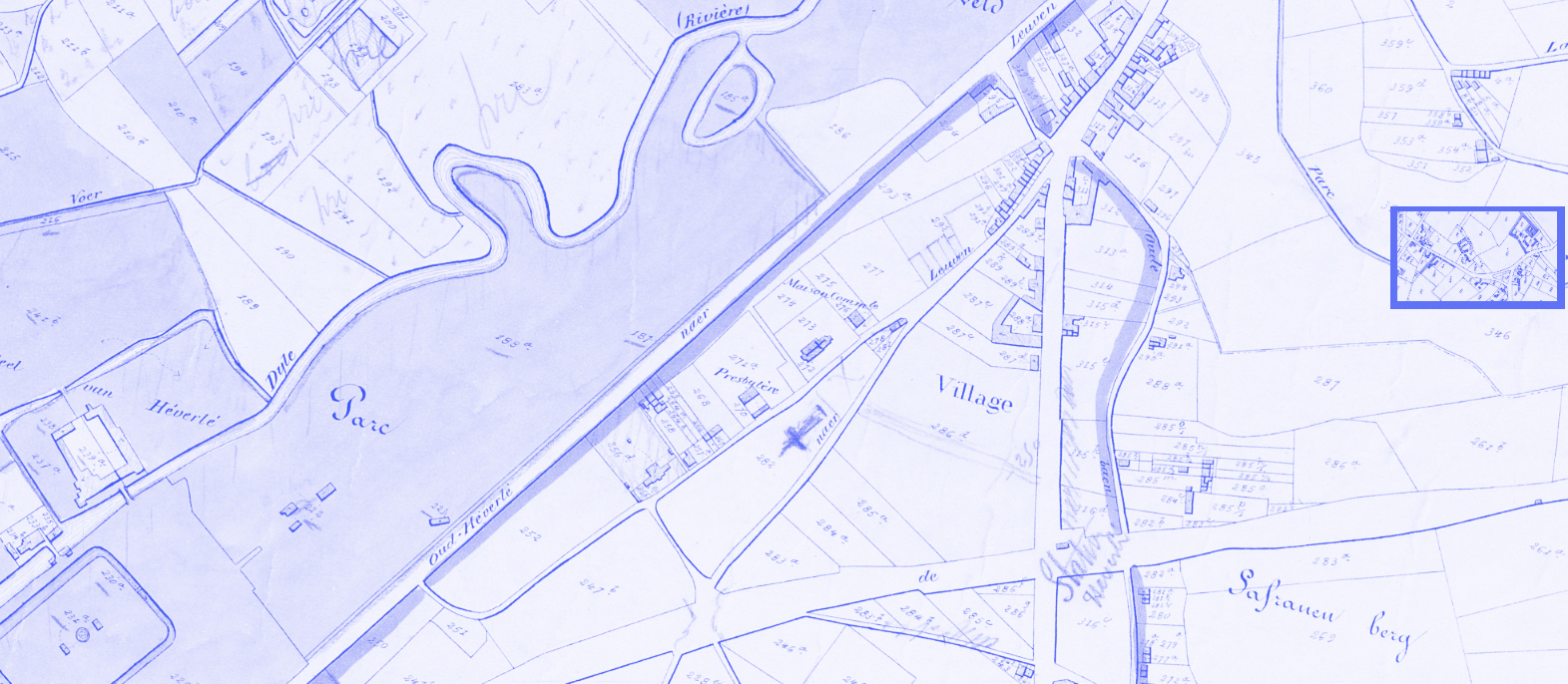 The residential core of Heverlee is located on a headland between the Naamsesteenweg, the railway, the castle park and the grounds of the football and tennis clubs.